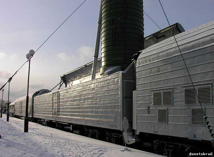 испытаний БЖРК с МБР РТ-23 был принят в опытную эксплуатацию. ![]() Постановлением ЦК КПСС и СМ СССР от 9 августа 1983 года была задана разработка ракетного комплекса с ракетой РТ-23УТТХ "Молодец" (15Ж61) в трех вариантах базирования: боевой железнодорожный, подвижный грунтовый "Целина-2" и шахтный. Головной разработчик - КБ "Южное" (генеральный конструктор В.Ф.Уткин). В ноябре 1982 года был разработан эскизный проект ракеты РТ-23УТТХ и БЖРК с усовершенствованными железнодорожными пусковыми установками (ЖДПУ). В частности, для стрельбы с любой точки маршрута, в том числе с электрифицированных железных дорог, БЖРК был оснащен высокоточной навигационной системой, а ЖДПУ - специальными устройствами закорачивания и отвода контактной сети (ЗОКС). ![]() ![]() ![]() Комплекс принят на вооружение 28 ноября 1989 года. В 1991 году НПО "Южное" предложило использовать ракету типа РТ-23УТТХ для запуска космических аппаратов на орбиту Земли с высоты 10 километров, после сброса ракеты на специальной парашютной системе с тяжелого транспортного самолета АН-124-100. В состав БЖРК входит железнодорожный состав стандартной для комплекса конфигурации: -три трехвагонных пусковых модуля с МБР РТ-23УТТХ; -командный модуль в составе 7 вагонов; -вагон-цистерна с запасами горюче-смазочных материалов; -два тепловоза ДМ-62. В каждом из локомотивов несет дежурство отдельная локомотивная бригада. При подготовке офицерских локомотивных бригад БЖРК, для детального ознакомления с маршрутом, они периодически откомандировываются на гражданские составы МПС, следующие по тому же маршруту. ![]() БЖРК выглядит как обычный состав из рефрижераторных и пассажирских